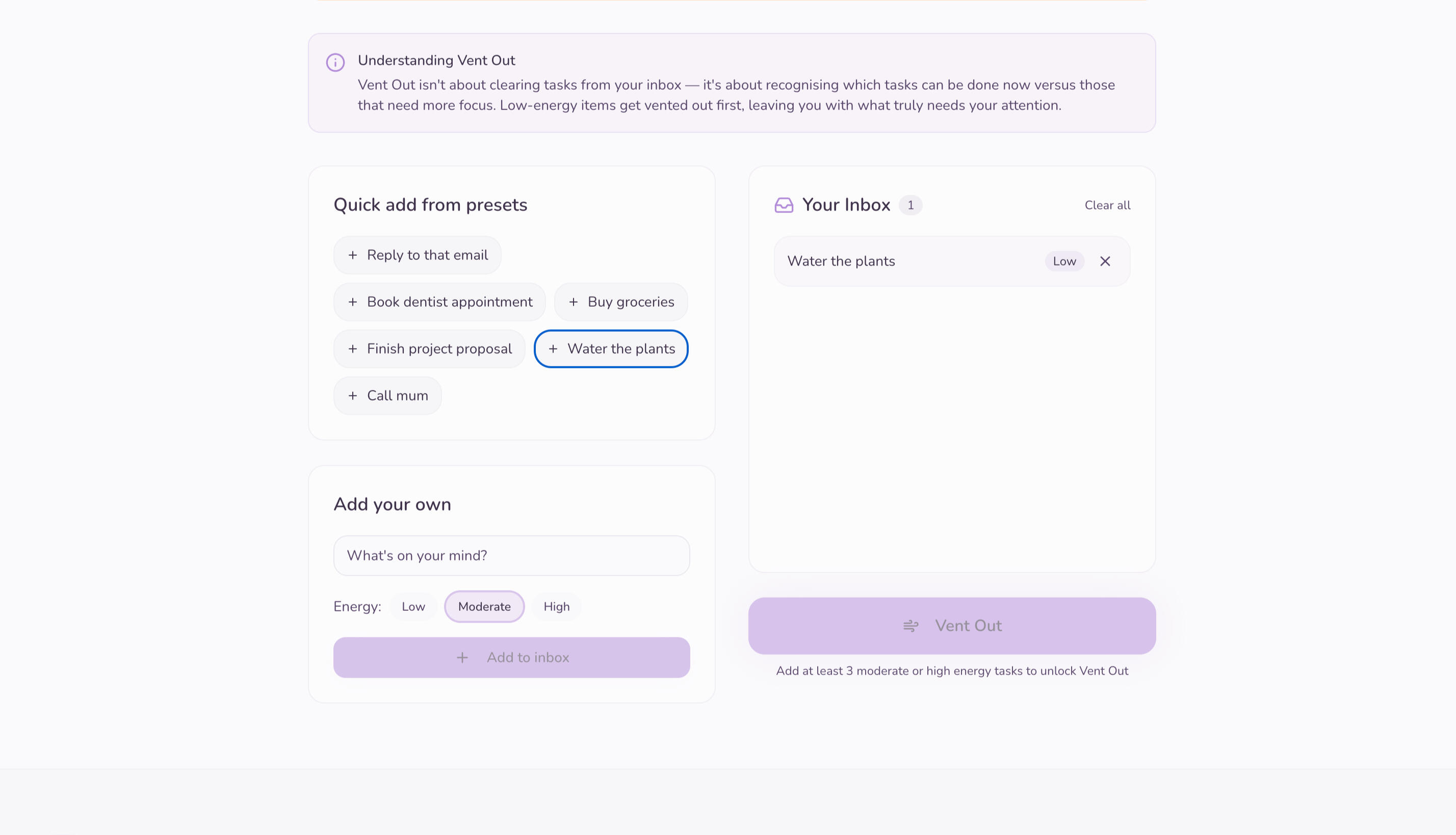 Vent & Flow provides a space to get thoughts out without turning them into tasks. It shows how thoughts shift over time, helping patterns emerge, and mental noise settle.