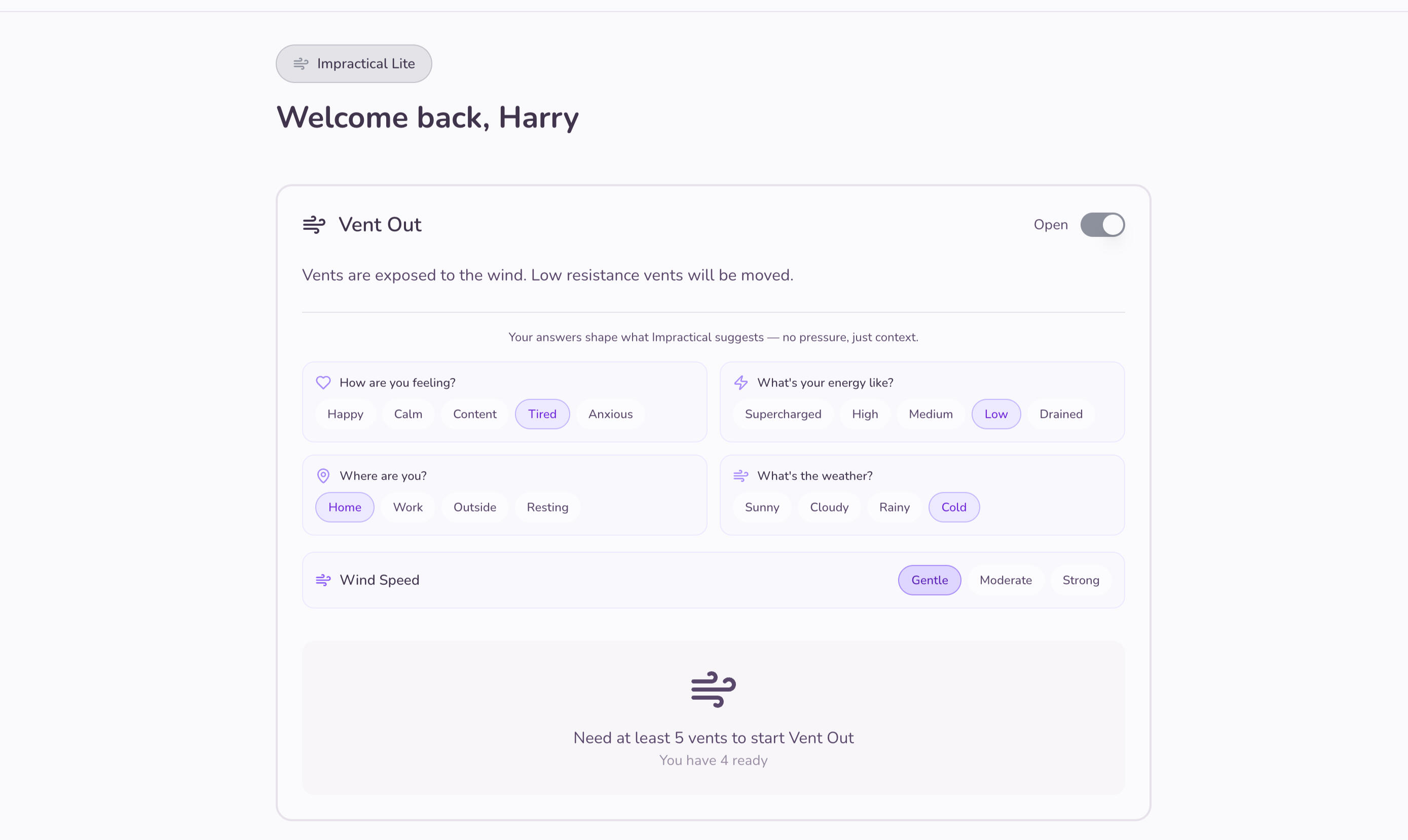 Check-in captures your mood and energy before you Vent Out. This grounds everything that follows in how you actually feel, not what we think you should do first.